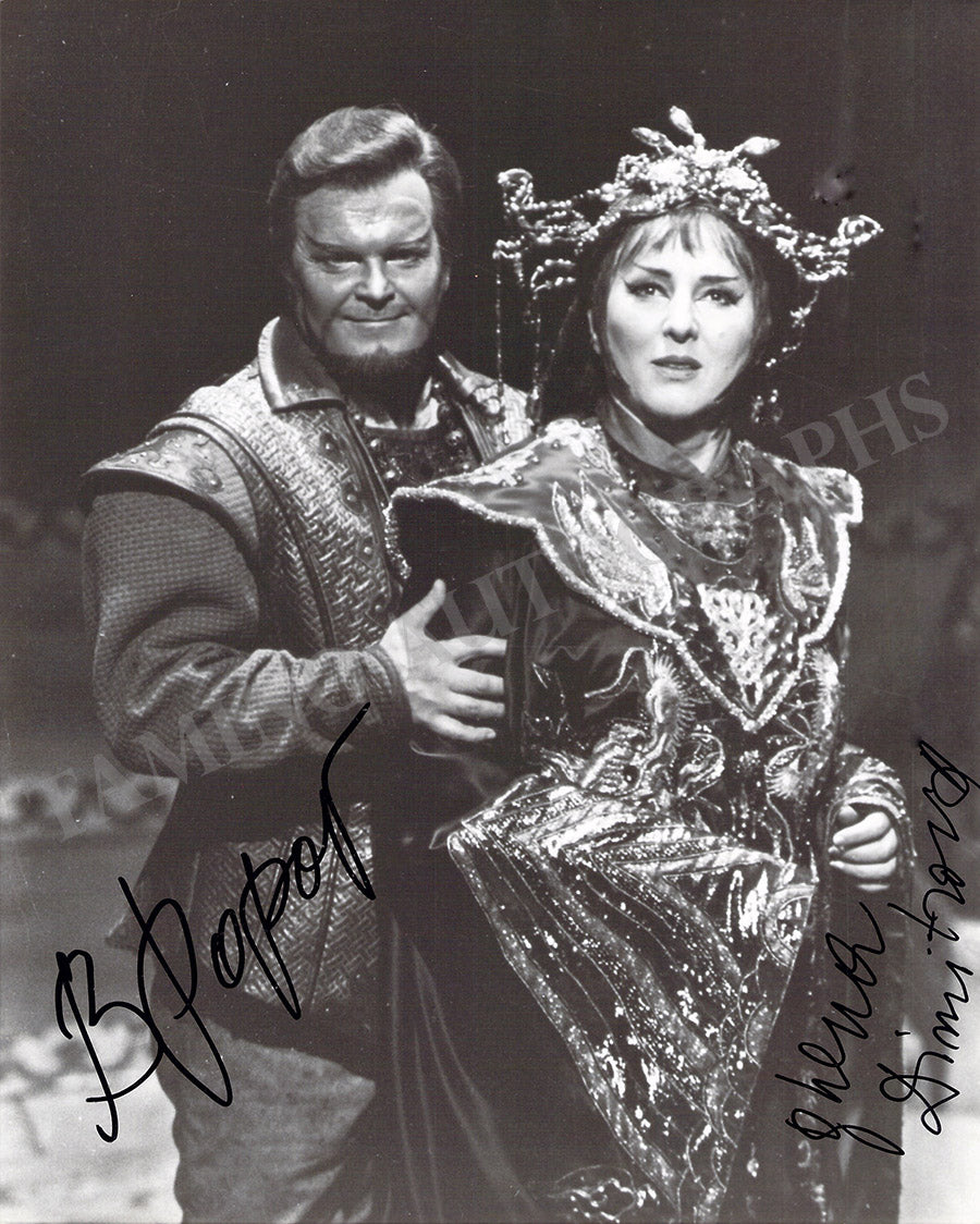 Fantastic black-and-white photograph signed by her and by Russian tenor B. Popov, shown as Turandot and Calaf at The Metropolitan Opera. Size is 7.9 x 10 inches, in excellent condition.