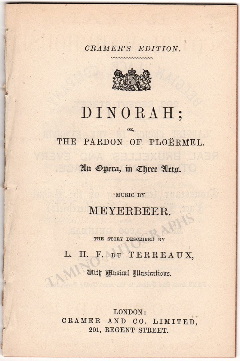 Program-libretto from the 1860s, for a performance of Meyerbeer´s opera "Dinorah". Opera was world premiered in Paris in 1859, arriving in London soon after, with Italo Gardoni in the main tenor role for the British premiere. Cast includes soprano Ilma de Murska and others, 46 pages, 4.5 x 6.9 inches, no covers, in excellent condition.