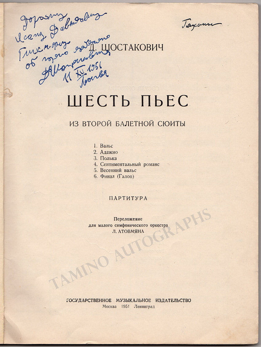 Printed score for his work "Six Pieces from the 2nd Ballet Suite" signed by him on the full title page, inscribed to his Russian friend and critic Isaac Glickman (1911-2003)in 1956. Size is 9 x 11 inches, printed in 1951, 101 pages plus softcovers, some wear over the front cover, otherwise in excellent condition.