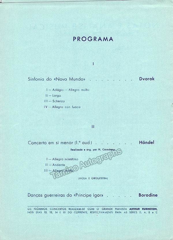 Double signed program for a concert of the Orquestra Sinfonica Nacional at the Teatro Nacional de San Carlos in Lisbon, Portugal on November 11, 1948 conducted by Dobrowen and featuring Boos as Violin soloist. Full 8 page program, signed by each artist inside program, next to their biography and underneath their publicity photo. Size of each page  is 6.25 x 8.75 inches, in very good condition.