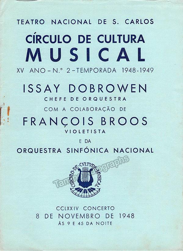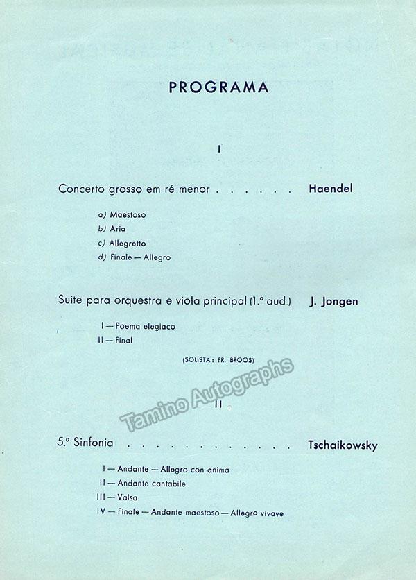 Program for a concert at Teatro Nacional San Carlos, Lisbon, 1948. Full program with all pages and covers, signed by conductor Dobrowen and violist Broos in their respective photo pages. Size is 6.5 x 8.6 inches, in excellent condition.