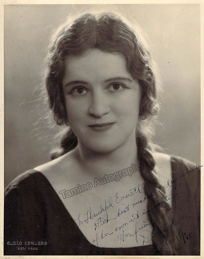 Signed photograph, shown in role (likely Brangene in Wagner's Tristan und Isolde), inscribed and dated in 1933. Blind stamped on front and stamped on verso by photographer Carlo Edwards, New York. Size is 7.75 x 10 inches, in excellent condition.