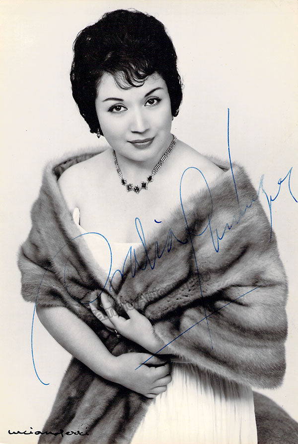 Mexican mezzo-soprano (1925-2013), signed photograph, shown as herself. Hand signed on front and stamped on verso by photographer Luciano Ferri. Size is 4 x 5.75 inches, in excellent condition.