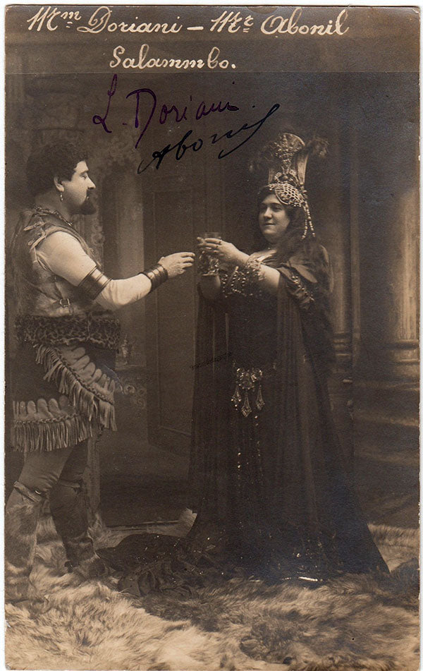 French soprano Lysiane Doriani and the French tenor (or "fort ténor) Abonil (whose first name is unknown), double signed postcard photograph, shown in roles in Ernest Reyer's opera Salammbo. Photo by G. Halleux-Mertens, Anvers. Size is 3.5 x 5.5 inches, slight silvering at the top, otherwise in excellent condition.