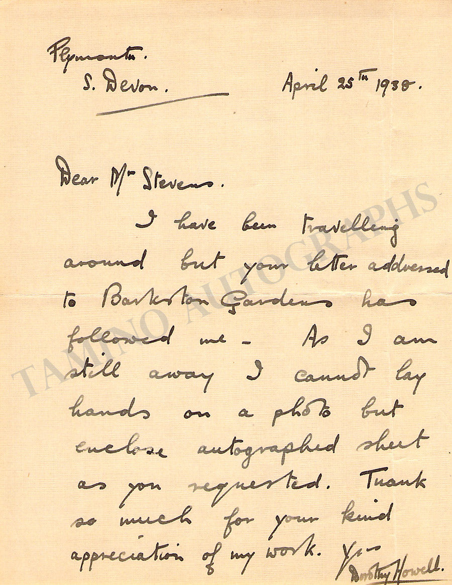 Autograph letter signed by her, dated 1938. Size is 4.8 x 6.3 inches, 1 written page, folds, in excellent condition.