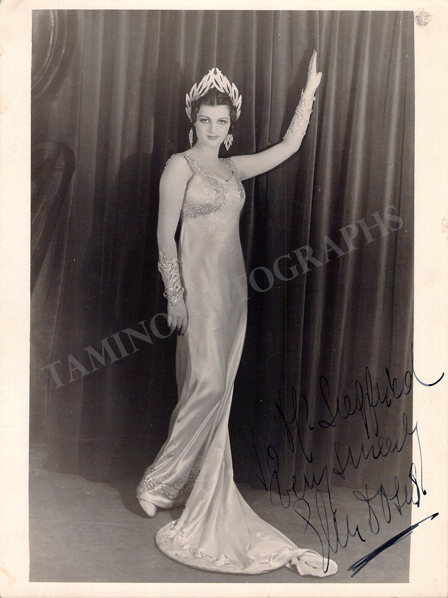 Greek-born French soprano (1913-2002), signed photograph, shown in role, inscribed. Stamped on verso by photographer David of Paris. Size is 7 x 9.5 inches, in very good condition.