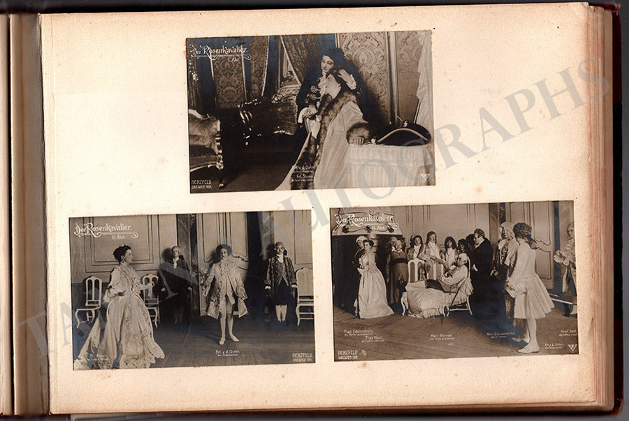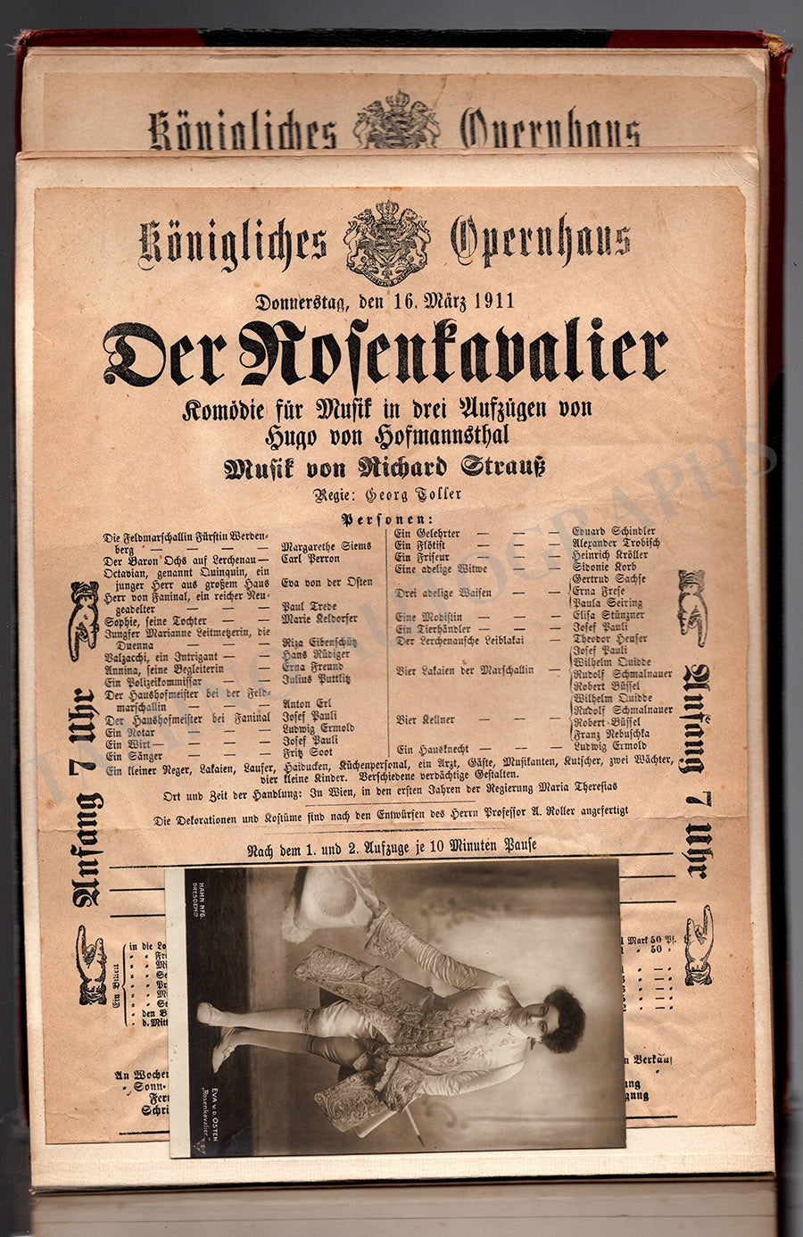 Beautiful collection of 22 album pages with 28 original photo postcards and 13 original playbills for performances at the Dresden Opera House (Konigliches Opernhaus Dresden) for the year 1911, mounted on pages (cannot be removed).