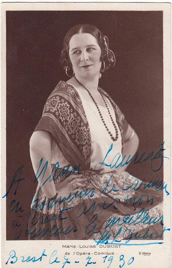French mezzo-soprano, signed postcard photograph, shown in role in Bizet's Carmen, inscribed and dated in 1930. Photo by B. Henry. Size is 3.5 x 5.5 inches, in excellent condition.