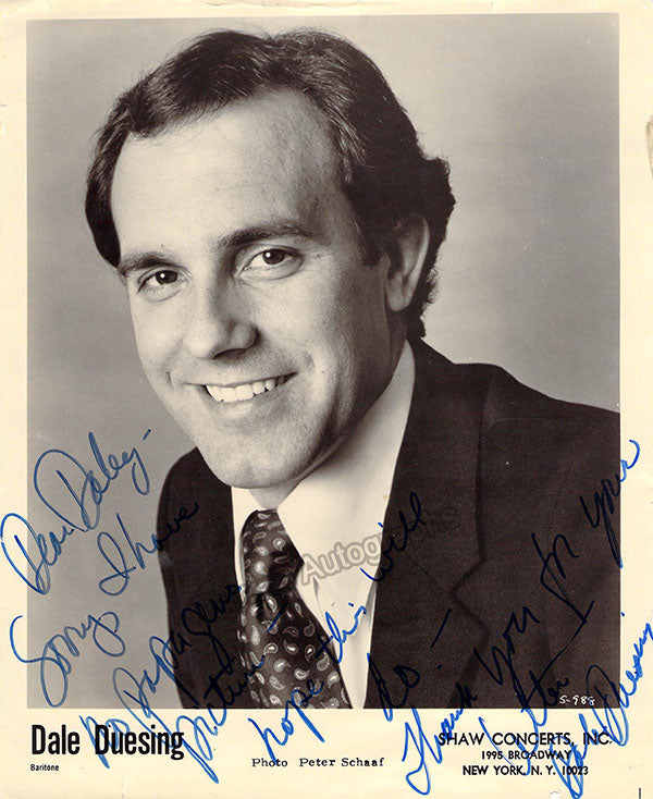 American baritone (b. 1947), signed publicity photograph, shown as himself, inscribed with sentiment. Photo by Peter Schaaf. Size is 8.25 x 10 inches, several creases, otherwise in good condition.