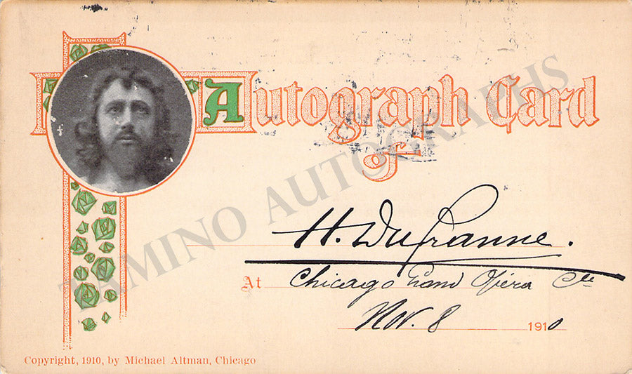 Belgian bass-baritone (1870-1951), signed postcard, which also contains a photographic image of him in role (likely Jochanan in Richard Strauss's Salome), dated in Chicago in 1910. Bold handwriting and signature. Size is 3.25 x 5.5 inches, vintage item in excellent condition!