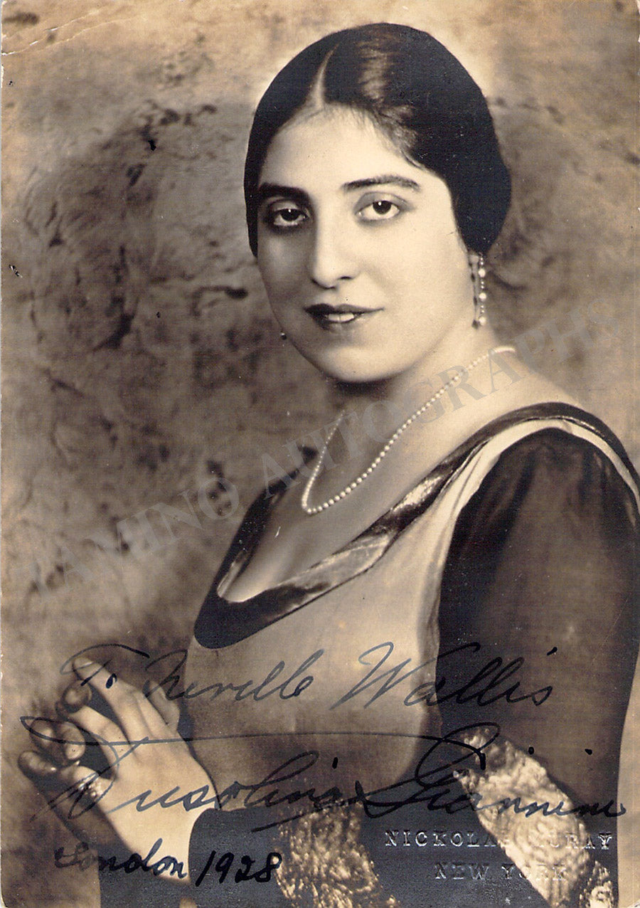 Fine black-and-white photograph signed and inscribed by her in London, 1928; blind-stamped on the front by photographer Nicholas Muray (New York). Size is 3.7 x 5.25 inches, in excellent condition.