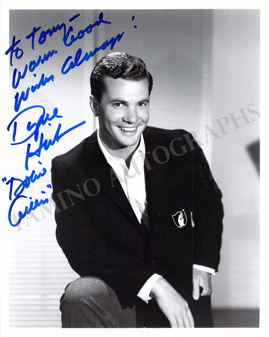 Fine black-and-white photograph signed and inscribed by him with a short sentiment, shown in the sitcom "The Many Loves of Dobie Gillis" (1959-1963). Size is 7.9 x 9.9 inches, in excellent condition.