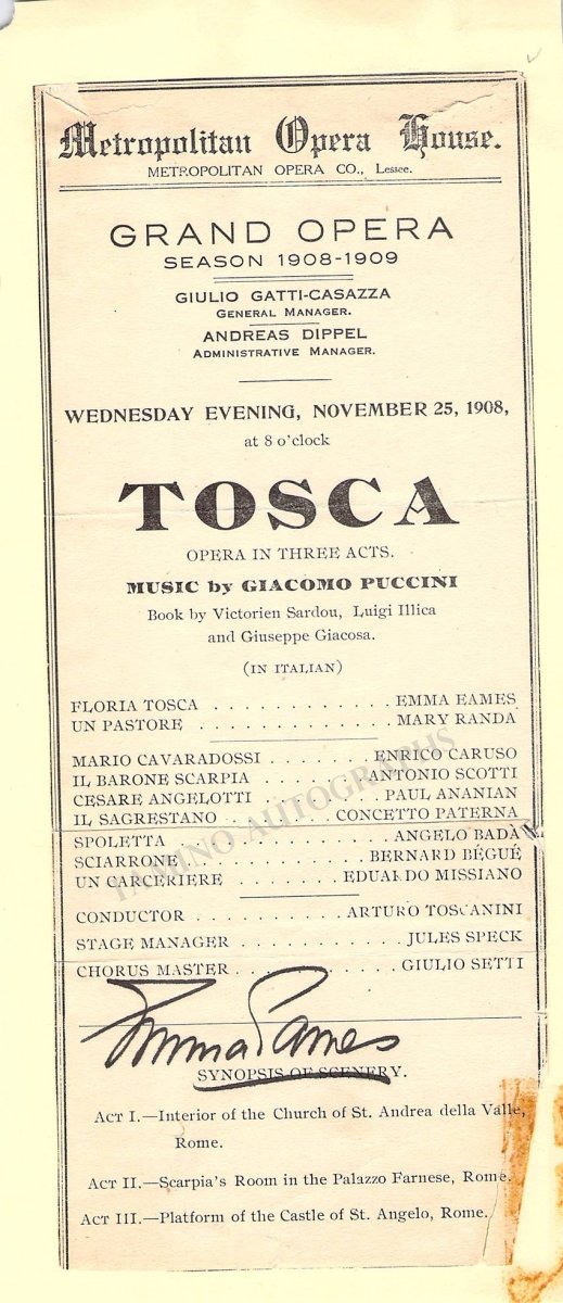 Signed program clip for a performance of Tosca at the Met Opera in New York, 1908, shown next to Enrico Caruso. Size is 3.5 x 8.4 inches, attached to a slightly larger piece of an album page, in very good condition.