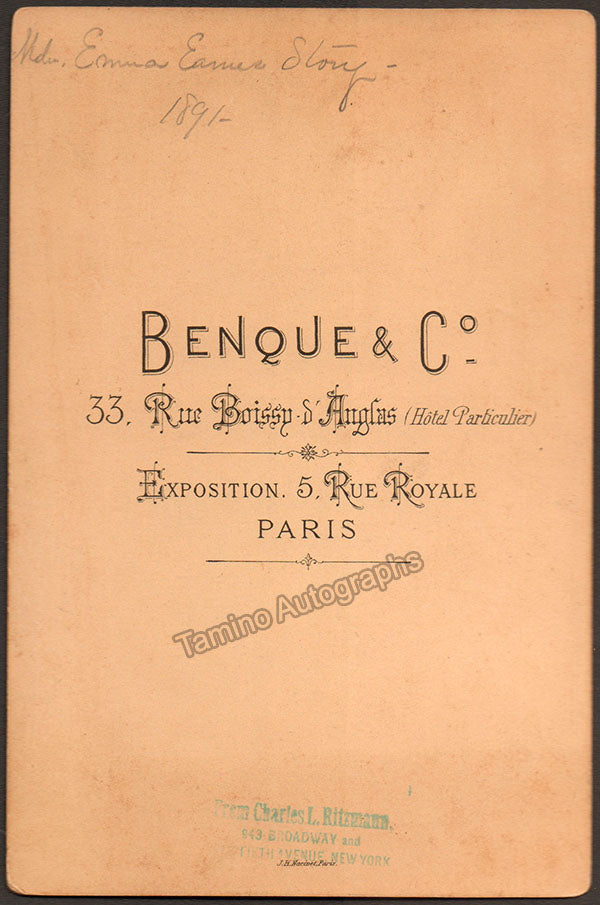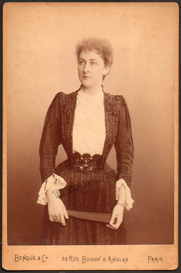 Unsigned cabinet photo, shown as herself, photo by Benque photographers, Paris. Size is 4.25 x 6.5 inches, in excellent condition.