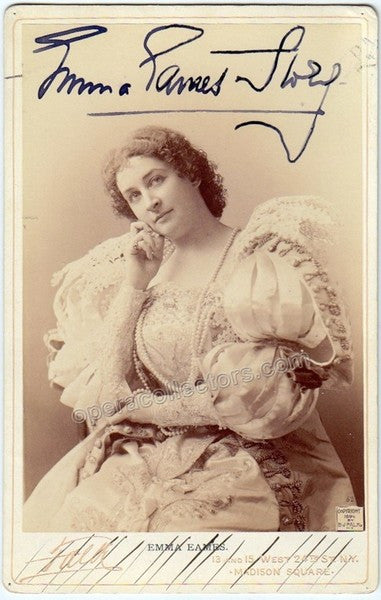 ALSO included are: - An original clip from a Metropolitan Opera program for a performance of Le Nozze di Figaro on Jan 1st, 1902, with Eames in this role. - An advertising clip from a magazine, 1902, showing Eames endorsing the Simplex Pianos. A great trio to collect together!