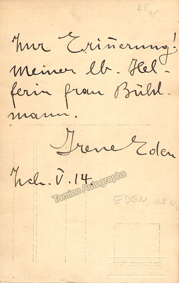 German coloratura soprano (1885-1975), signed postcard photograph, shown in role, signed on front with additional signature and inscription on verso, dated in 1914. Blind stamped on front by photographer Alex Ehrenzwei. Size is 3.5 x 5.5 inches, slight paper loss on edges, otherwise in excellent condition.