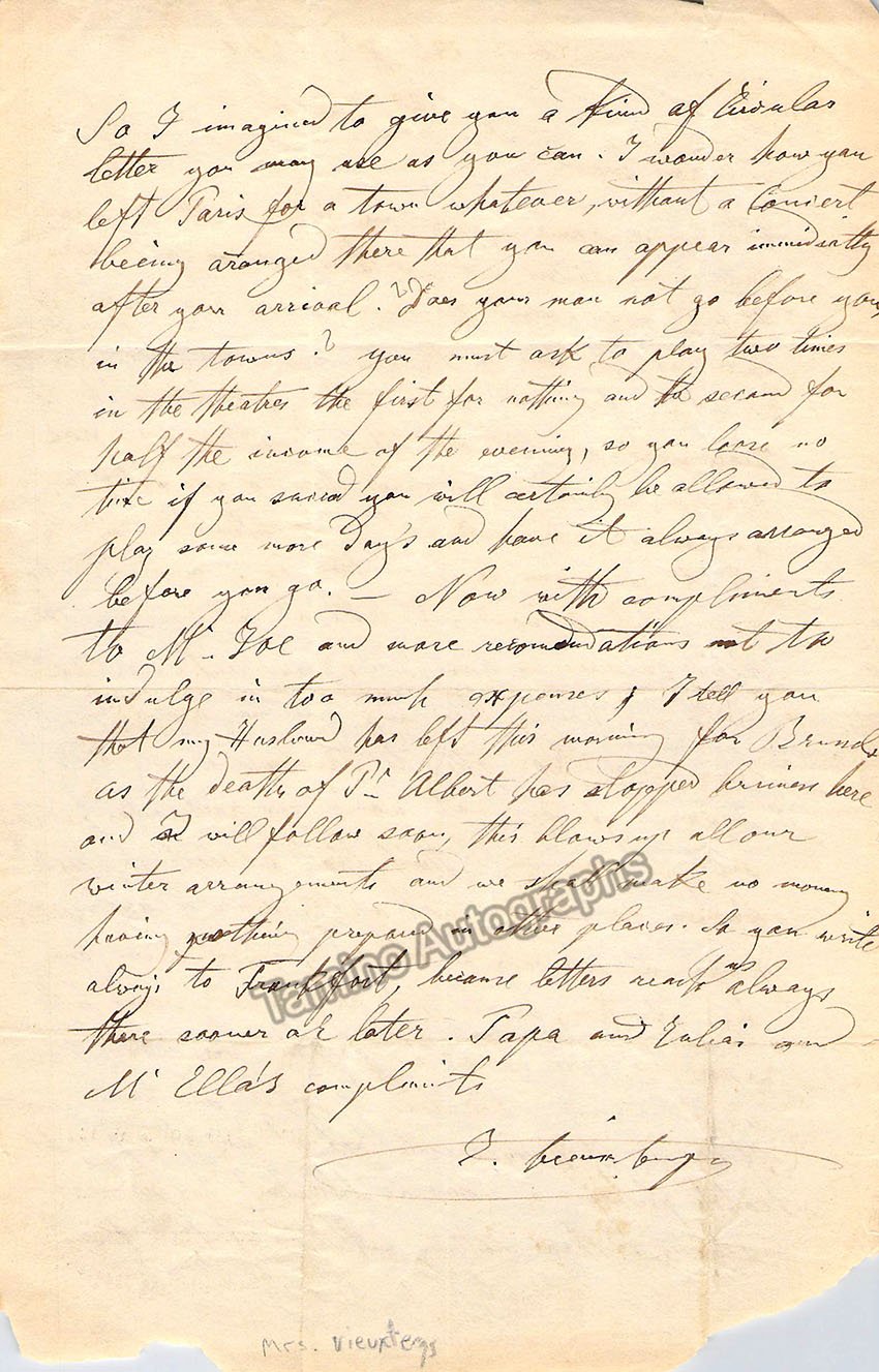 Eder Vieuxtemps, Josephine (Madame Vieuxtemps) - Autograph Letter Signed 1861
