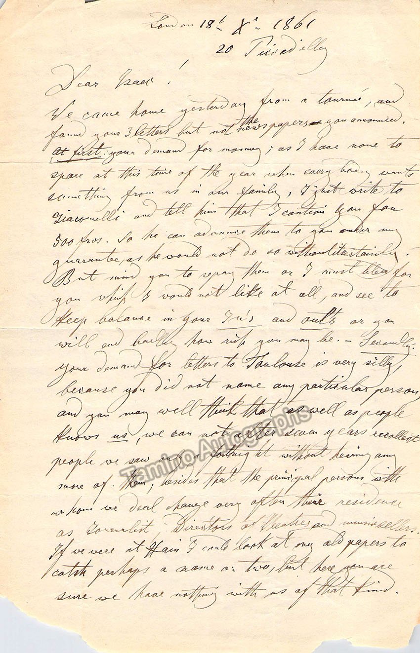 Autograph letter signed by her, written by both sides in English, dated in London, 1861, about personal matters.  Size is 5.3 x 8.25 inches, 1 page, minor loss of paper on corners and folds, in overall very good condition.