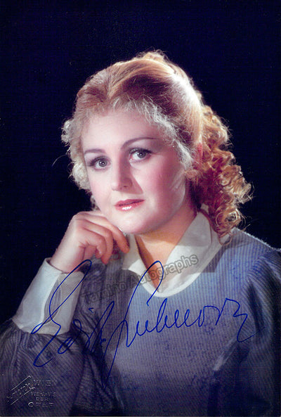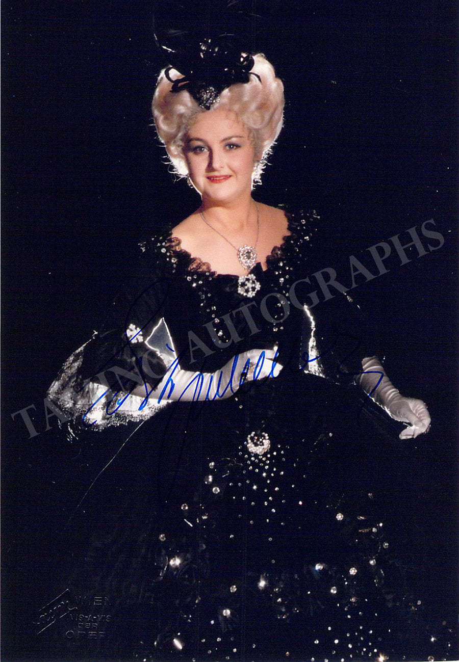 Beautiful color photograph signed by her, shown in role; blind-stamped over the lower-left corner by photographer Fayer, Vienna. Size is 3.9 x 5.75 inches, in excellent condition.