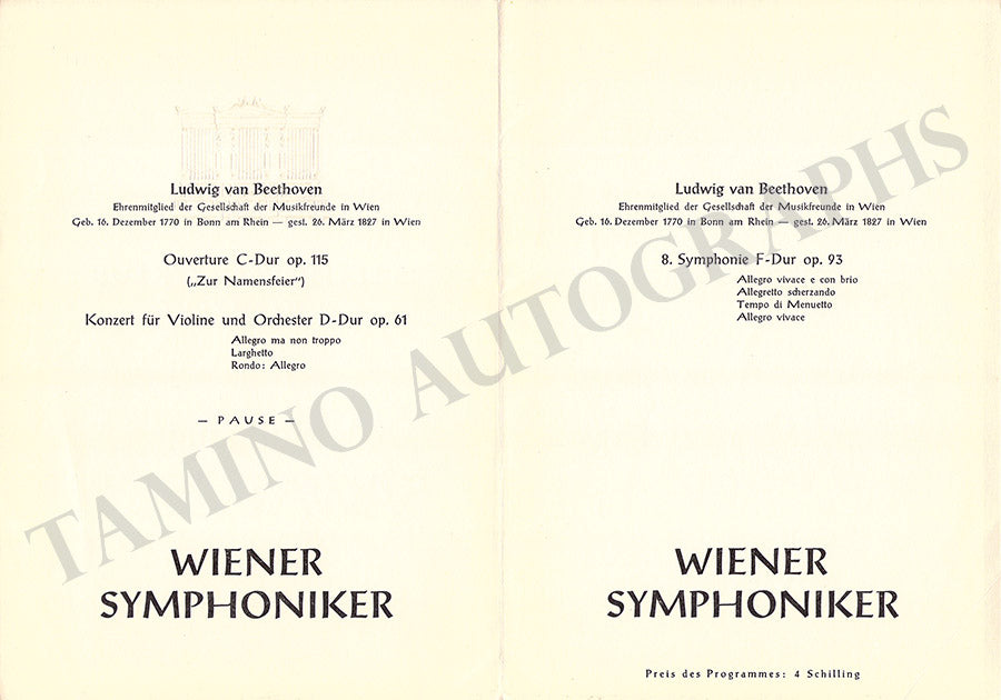 Concert program (unsigned) for a performance of the German violinist in Vienna on March 4th, 1962, with the Wienek Symphoniker under the baton of Wolfgang Sawalllisch.