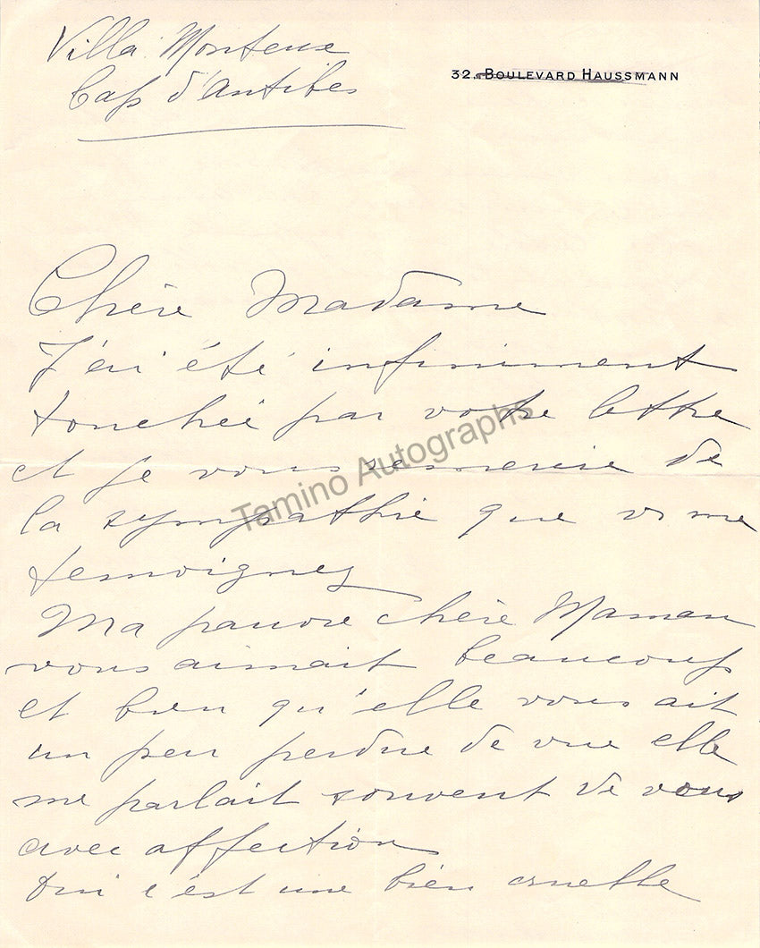 Autograph letter in French (sold untranslated) signed by her.  Size is 7 x 8.8 inches, 1 sheet, folds, in excellent condition.