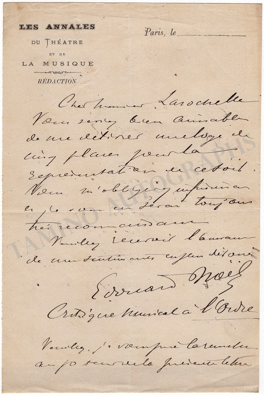 Autograph letter in French signed by him, not dated, to Monsieur Larochelle, concerning some theater seats. Size is 5.3 x 8 inches, folds, creases, overall age toning, with letterhead, in good condition.