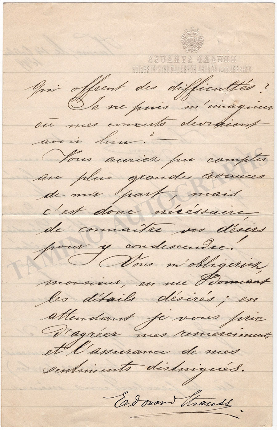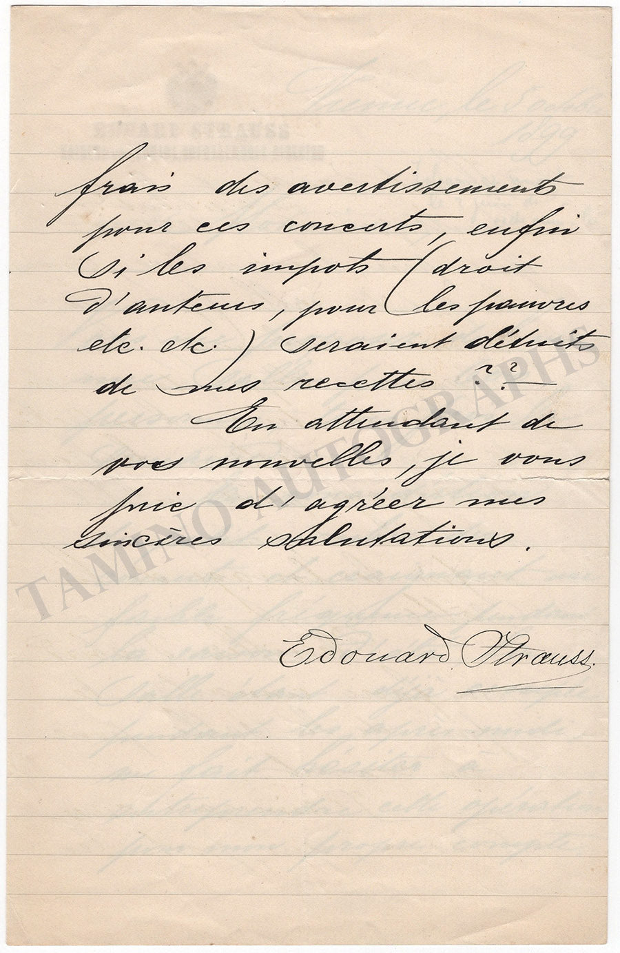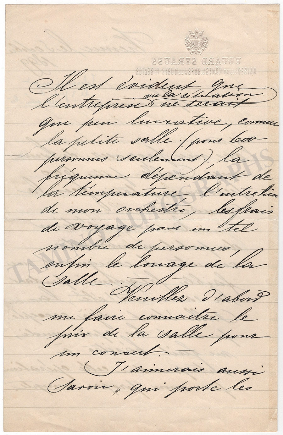 A. Vienne, le 5 Octobre 1899. To a gentleman: “…Vous me proposez de louer ma salle pour 600 personnes, trois fois la semaine. En considération du petit nombre des concerts et craignant une faibles fréquence pendant la saison d’été, la salle étant déjà occupée pendant les après midi, me fait hésiter à entreprendre cette opération pour mon propre compte…”. 3 pp. In-8. With gilded letterhead.