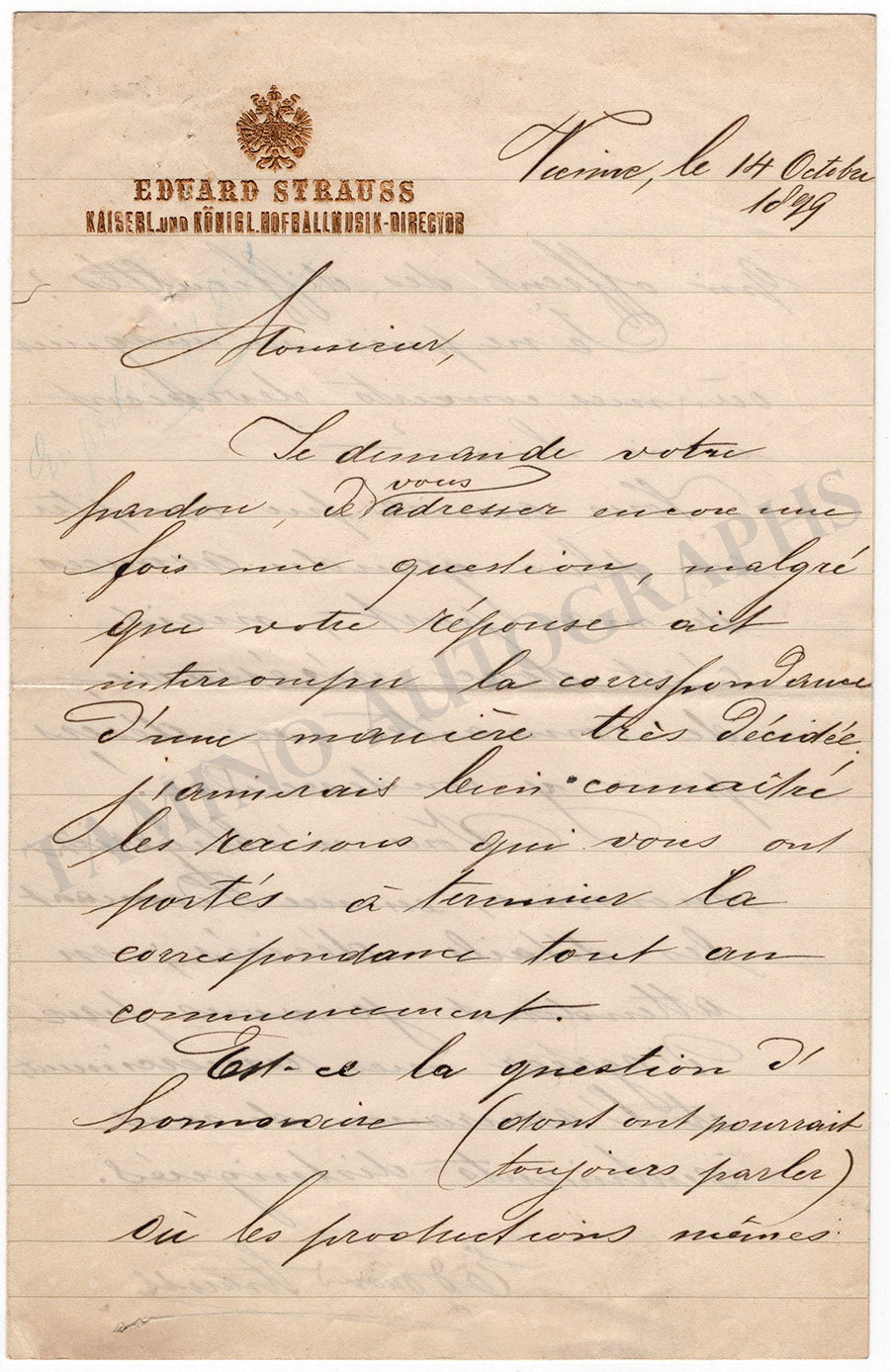 B. Vienne, le 14 Octobre 1899. To a gentleman: “…J’aimerai bien connaître les raisons qui vous ont portés à terminer la correspondance tout au commencement. Est-ce la question d’honoraire (dont on pourrait toujours parler) où les productions mêmes qui offrent des difficultés?…”. 2 pp. In-8. With gilded letterhead.