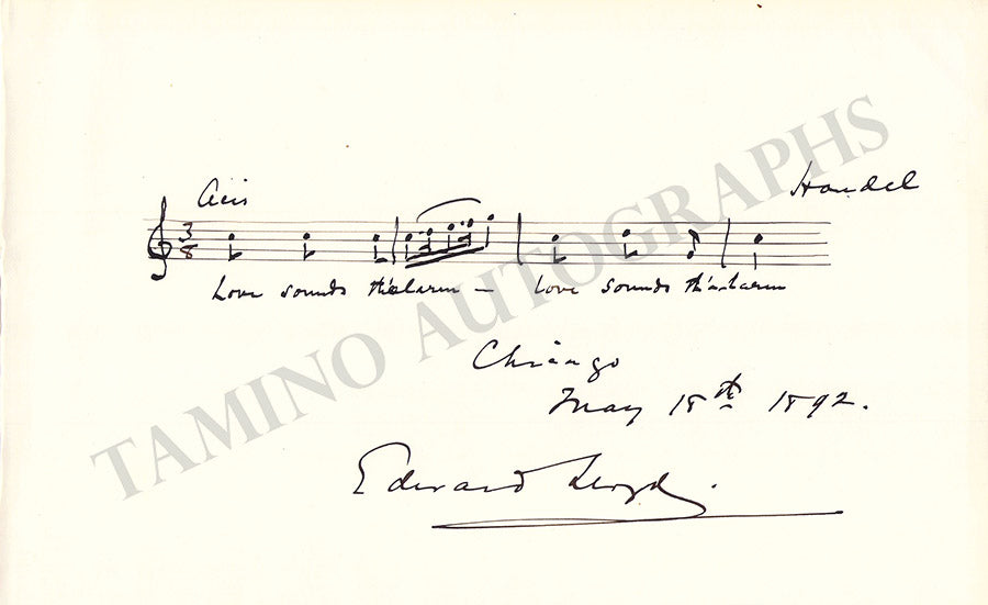 Autograph musical quote signed (music of Handel), dated in Chicago in 1892. Bold handwriting and signature. This is an album page of 5.5 x 9.25 inches, in excellent condition.