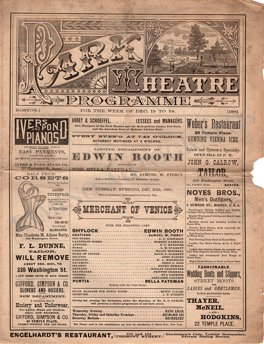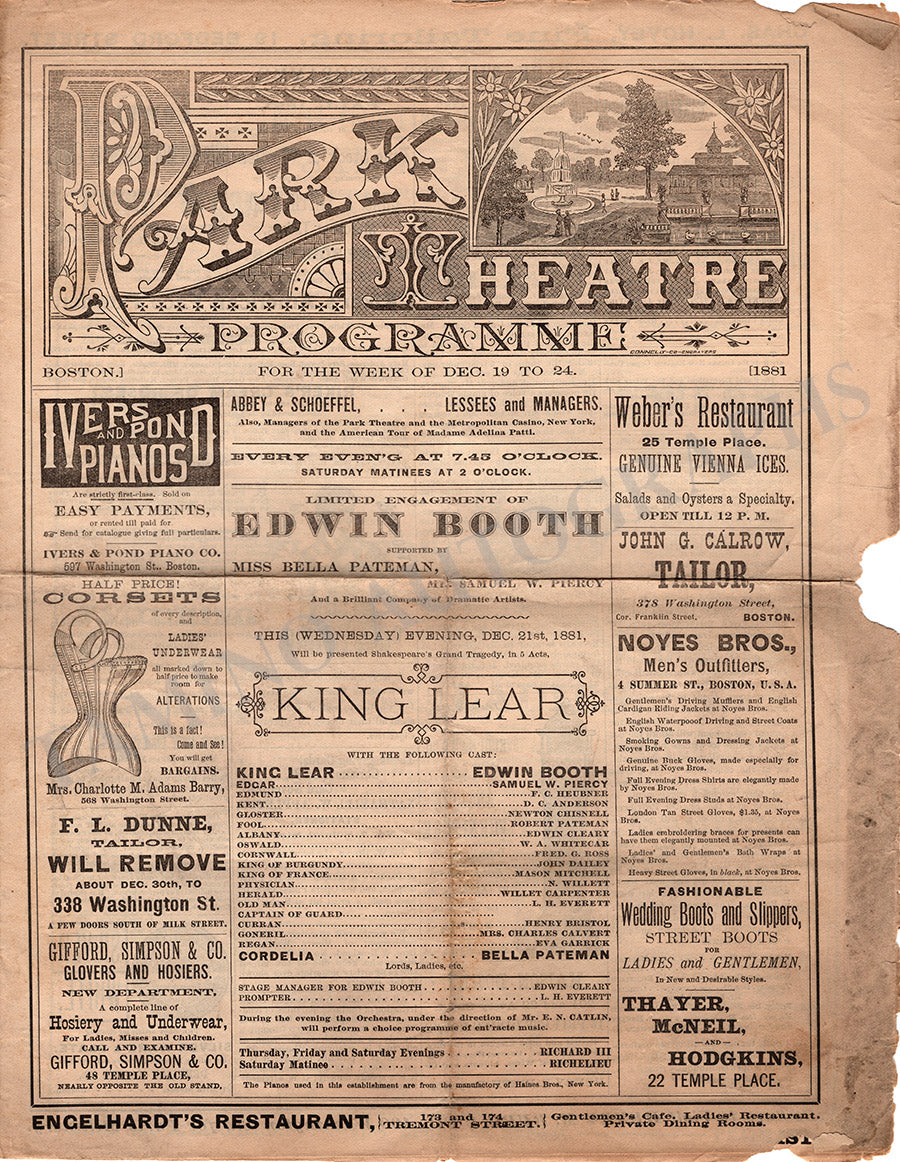 ALSO INCLUDED are two programs for performances of The Merchant of Venice and King Lear on December 20 and 21, 1881, featuring Booth in the respective title roles. Size is 9.9 x 12.9 inches each, 4-pages long each, rust and dirt stains, some cracks, in fair condition.
