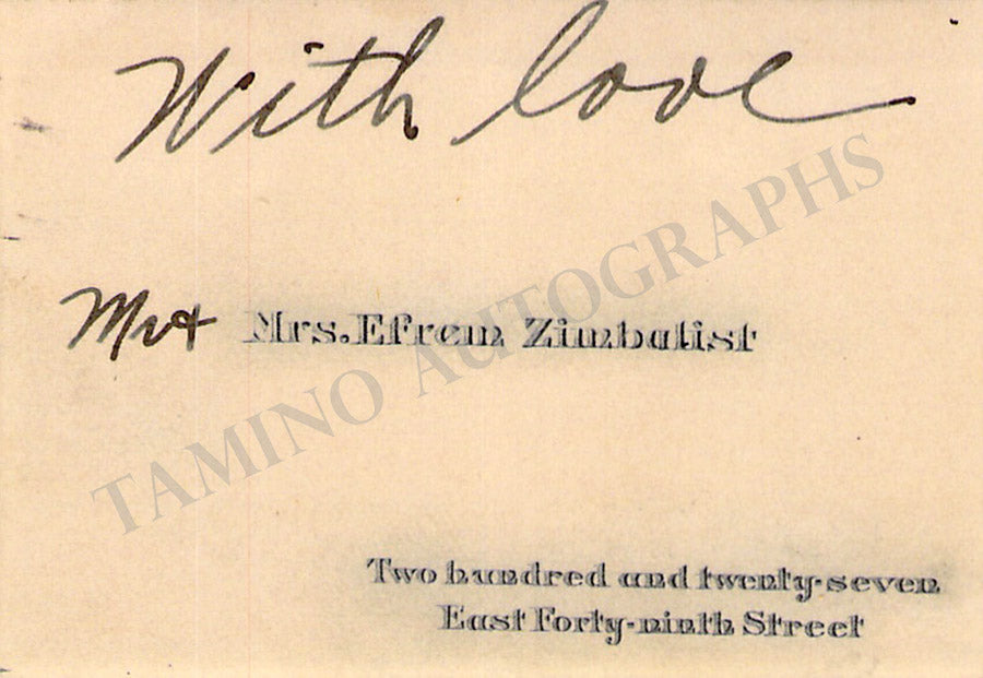 His business card with a short sentiment written by him. Size is 2.9 x 2 inches, overall soft age-toning, in overall excellent condition.
