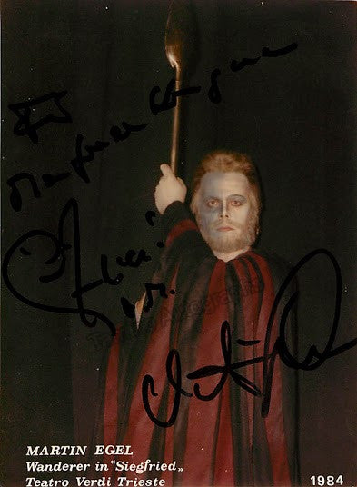 German bass-baritone (b.1949).  Signed photo shown as The Wanderer in Wagner's Siegfried at Teatro Trieste, 1984. Stamped on verso by photographer De Rota, Trieste. Size 4.5 x 6 inches.