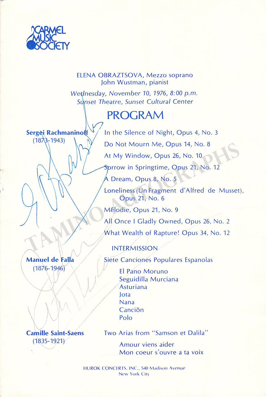 Program for a performance of the star Russian mezzo-soprano at the Sunset Theater, in Carmel, CA, USA, in 1976, signed by her on the program page.