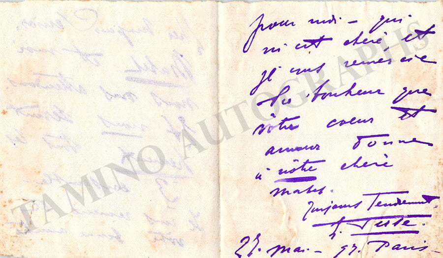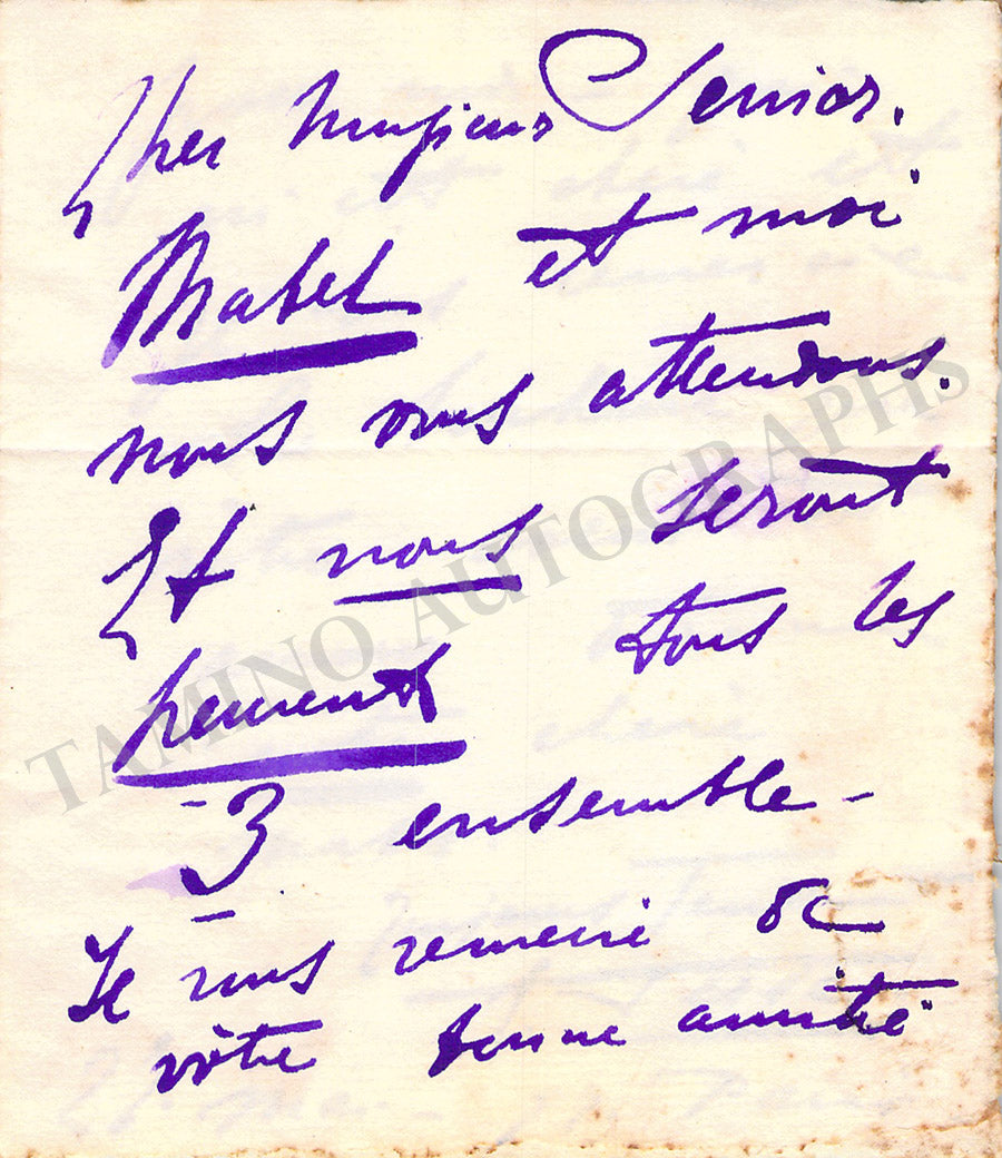 Autograph letter in French (untranslated) signed by her, no year indicated. Each page's size is 4.3 x 5.1 inches, 2 written pages in one folded sheet, some stains and folds, in overall good condition.