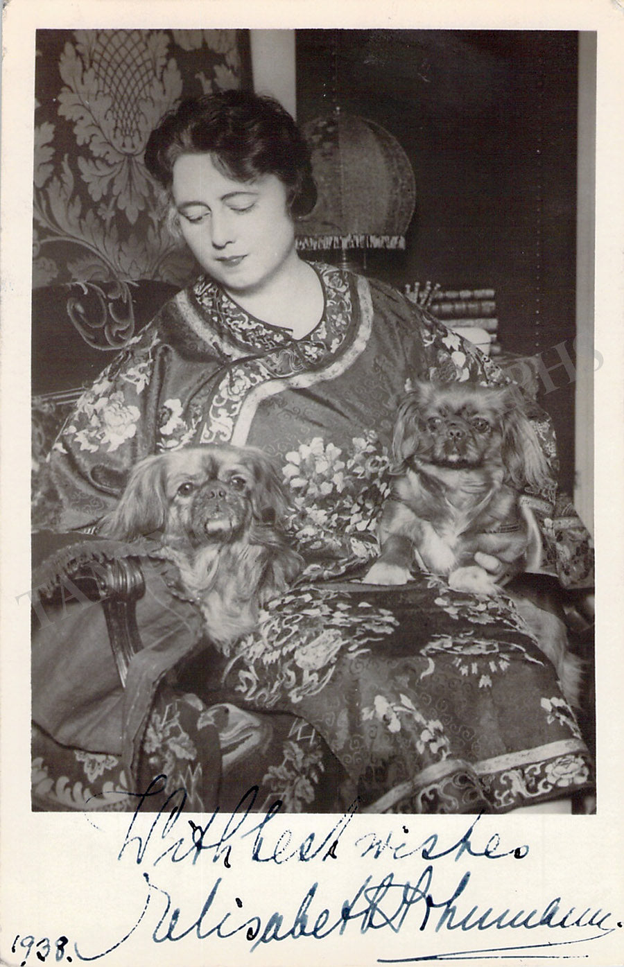 Black-and-white photo postcard signed by her with a short sentiment dated 1938. Size is 3.5 x 5.5 inches, in excellent condition.