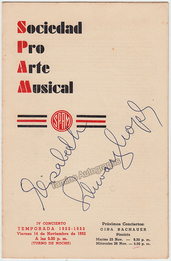 Program for a recital of the celebrated German-British soprano at SPAM -Sociedad ProArte Musical, Havana, Cuba, on November 14th, 1952, signed by her on the cover.  Size is 5.4 x 8.6 inches, 4 pages, in excellent condition.