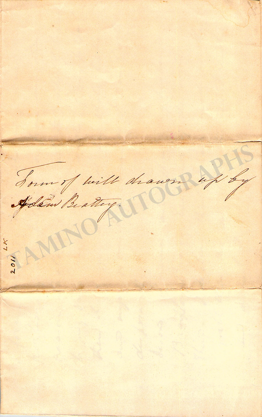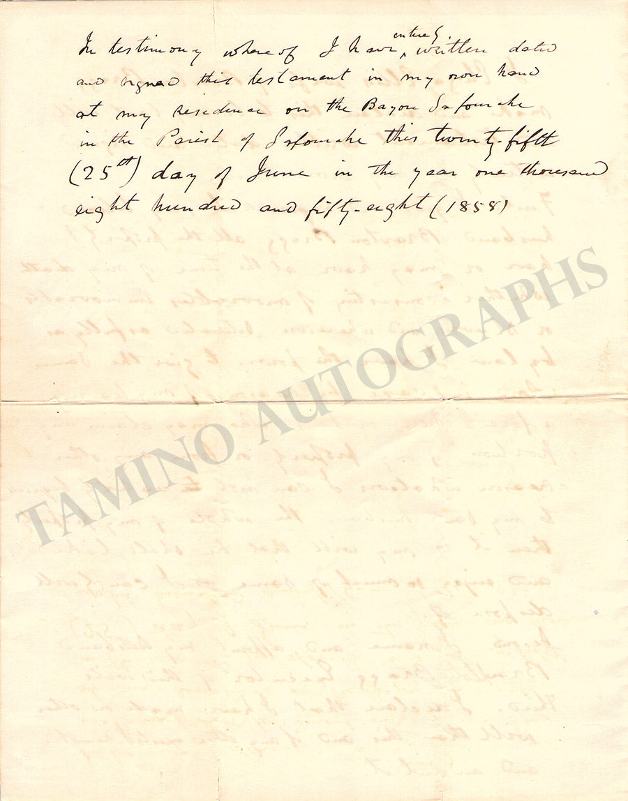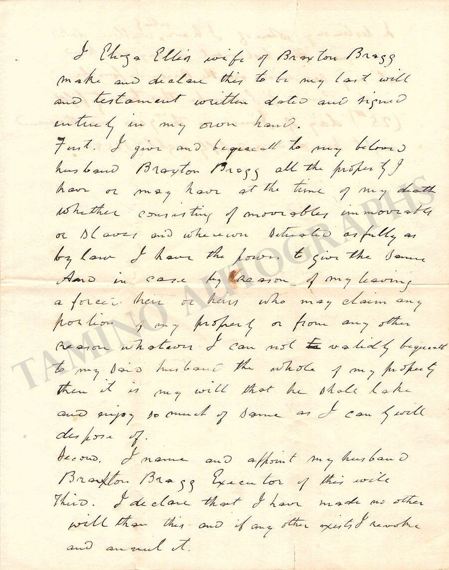Her autograph testament where she mentions her husband Braxton Bragg. Size is 7.75 x 9.8 inches, 2 written pages, folds, minor cracks, in overall very good conditon.