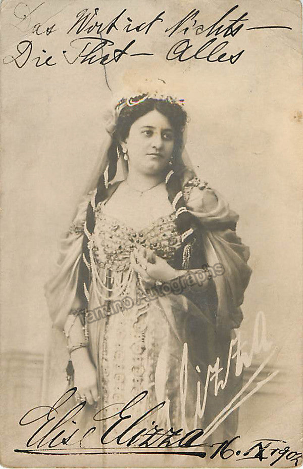 Austrian soprano (1870-1926), signed photo postcard, shown in role, dated in 1902. Size is 3.5 x 5.5 inches