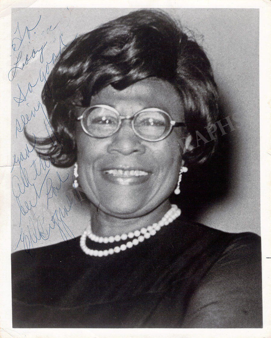 Black-and-white photograph signed and inscribed by her with a long sentiment. Size is 8 x 10.1 inches, minor creases, small cracks over the left border, in overall very good condition.