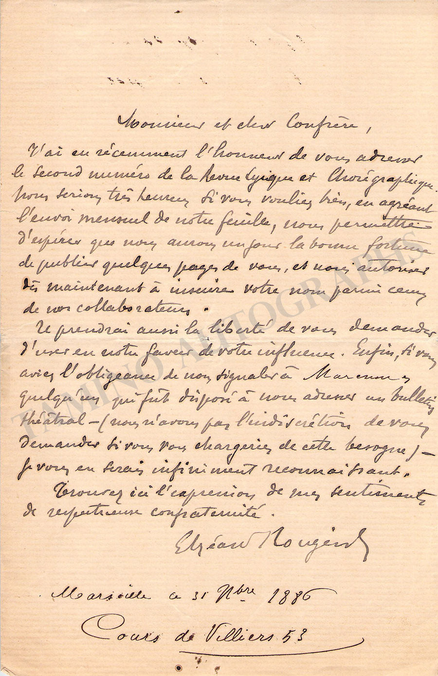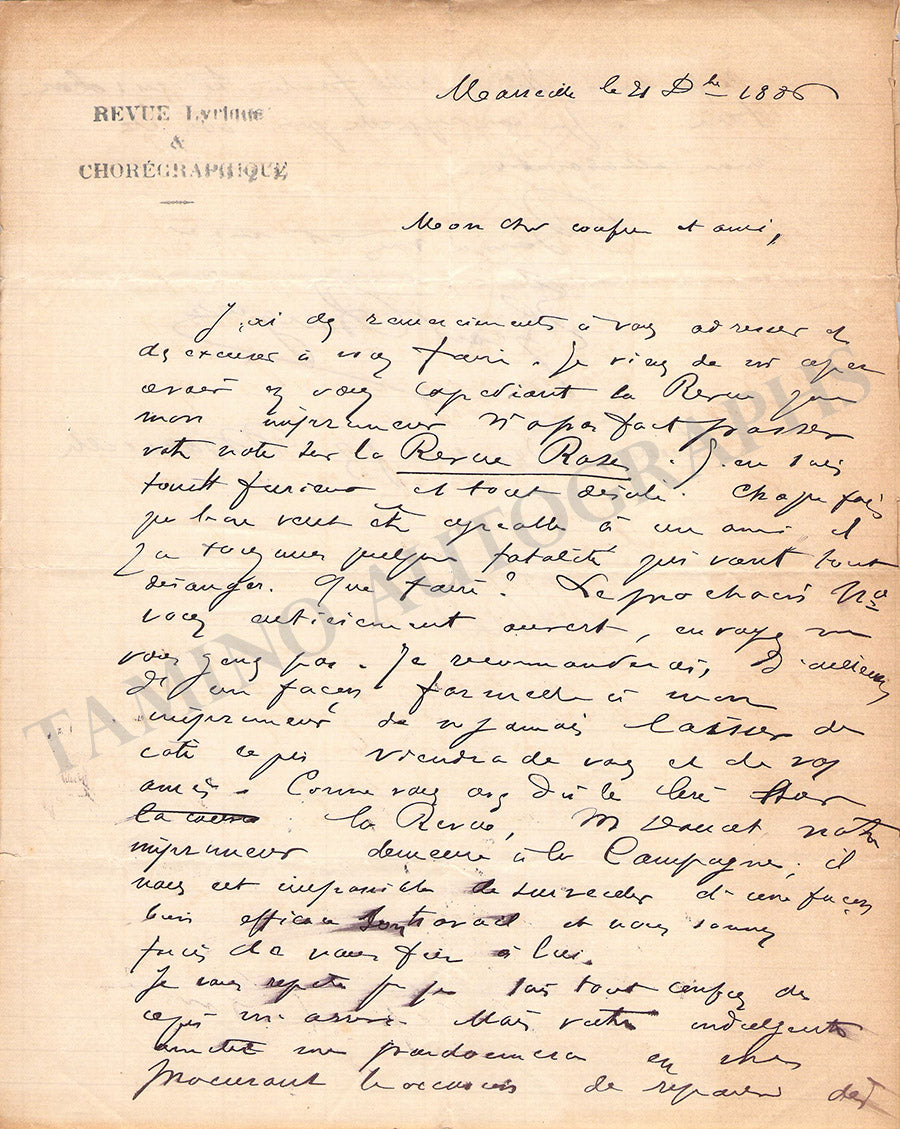 C. Marseille Dec. 4, 1886, with letterhead “Revue Lyrique & Choréographique”, concerning an article. 1 page.