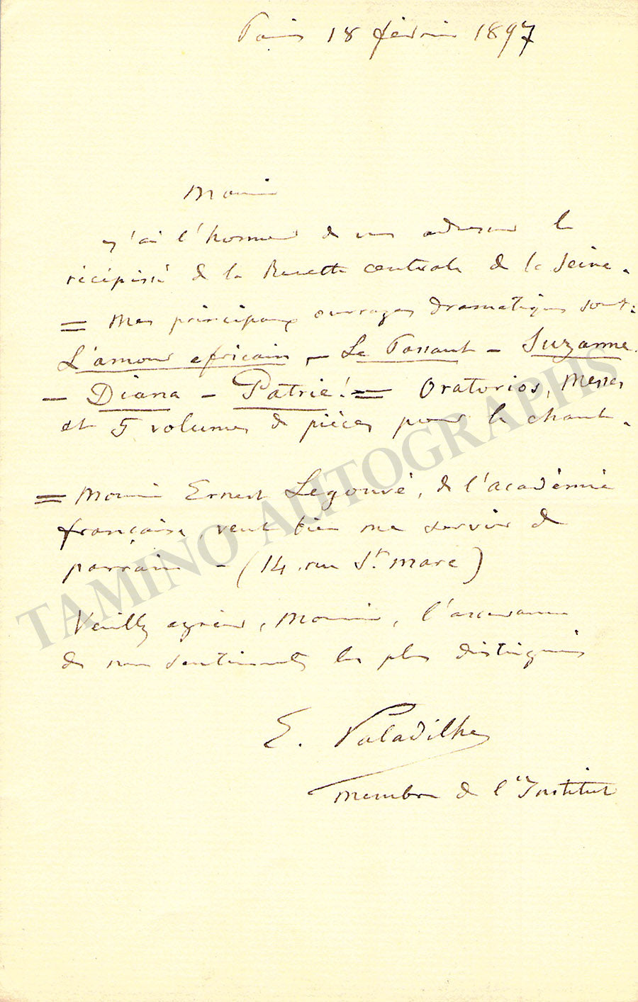 Autograph letter in French (untranslated) signed by him and dated 1897 where he mentions his works. Size is 4.4 x 6.9 inches, in very good condition.