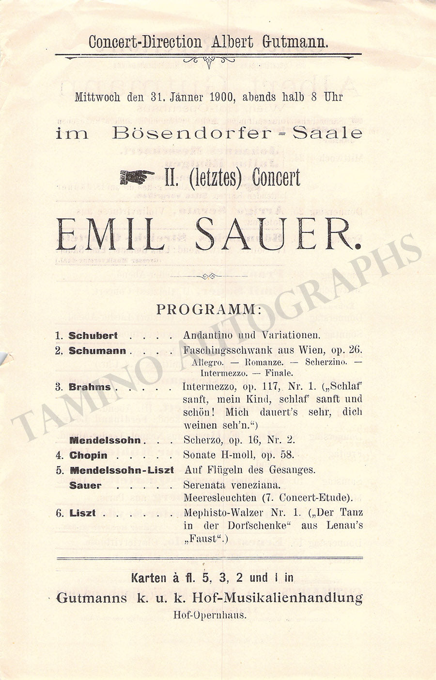 Concert program (unsigned) for a solo piano recital by the German pianist in Vienna, on January 31st, 1900, performing works by Schubert, Schumann, Brahms, Mendelssohn, Chopin, and Liszt.