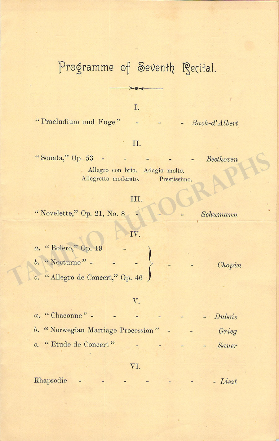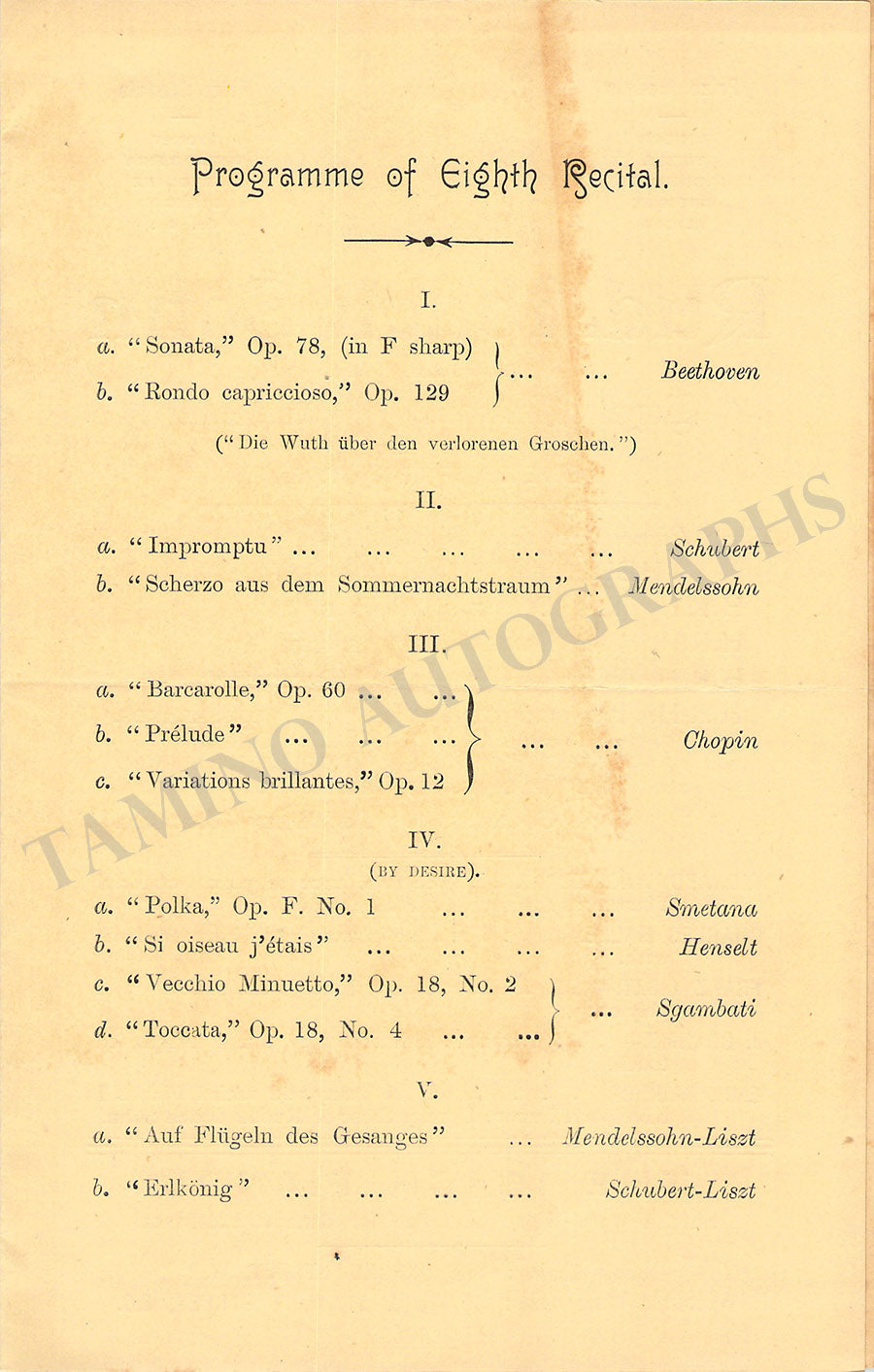 Fine set of 2 unsigned programs for performances of the celebrated German pianist at St. James' Hall, London, on December 14 and 17, 1894.