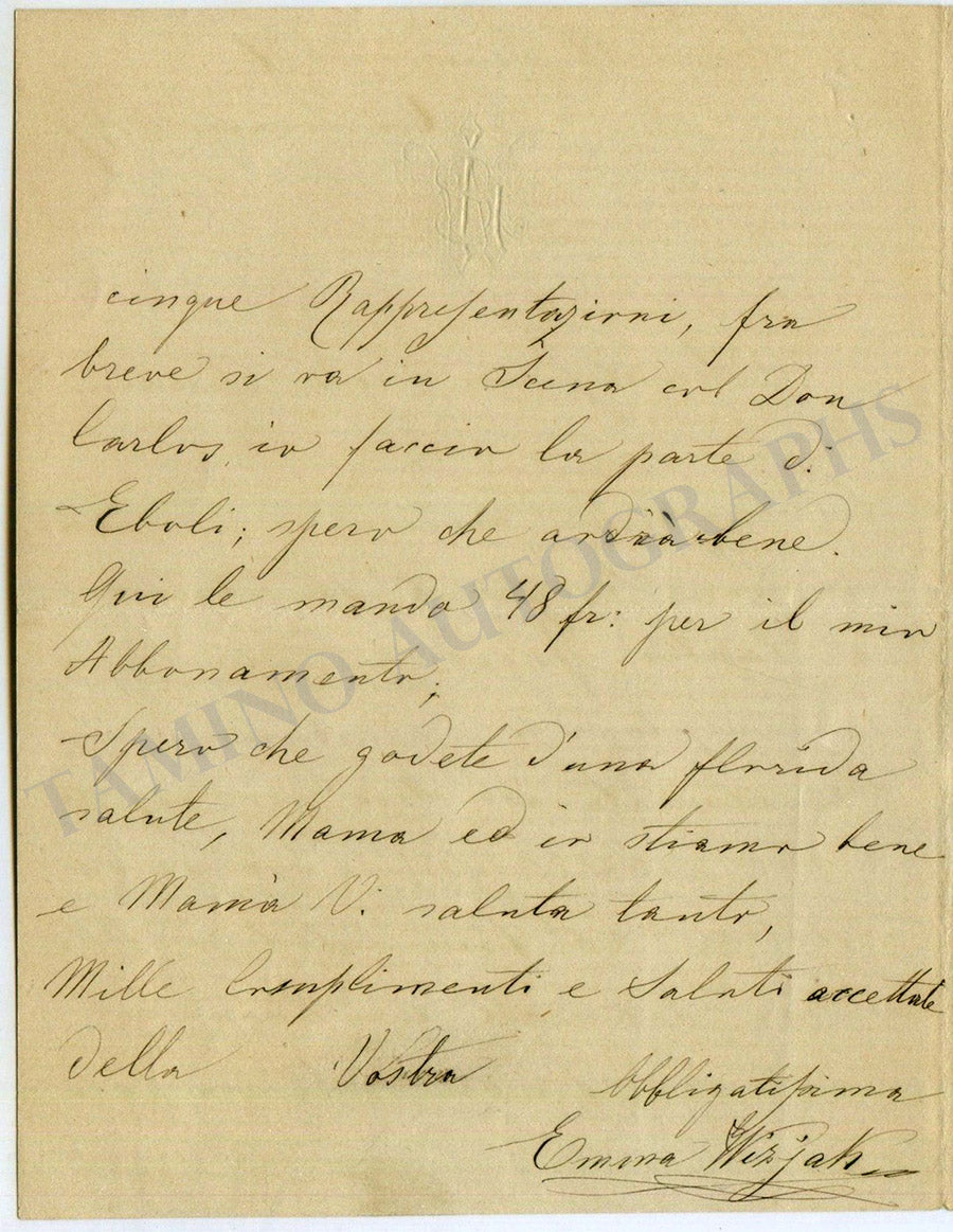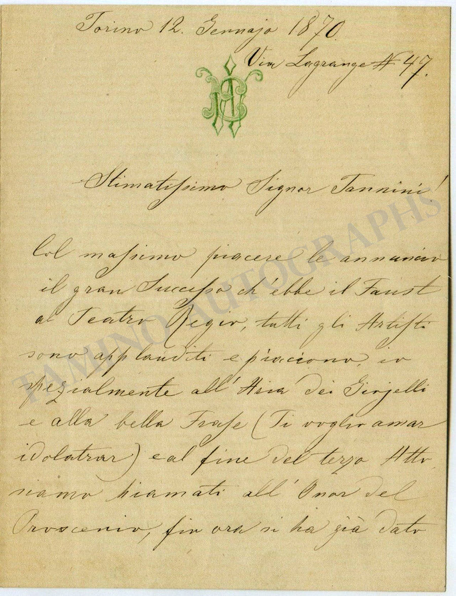 Rare autograph letter in Italian (untranslated) signed by her, dated in Torino, January 12, 1870, to Mr. Tannini: “…Col massimo piacere le annuncio il gran successo ch’ebbe il Faust al Teatro Regio, tutti gli artisti sono applauditi e piacciono, io spezialmente all’Aria dei Giojelli e alla bella frase (Ti voglio amar idolatrar) col fine del terzo Atto siamo chiamati all’… del proscenio…”.