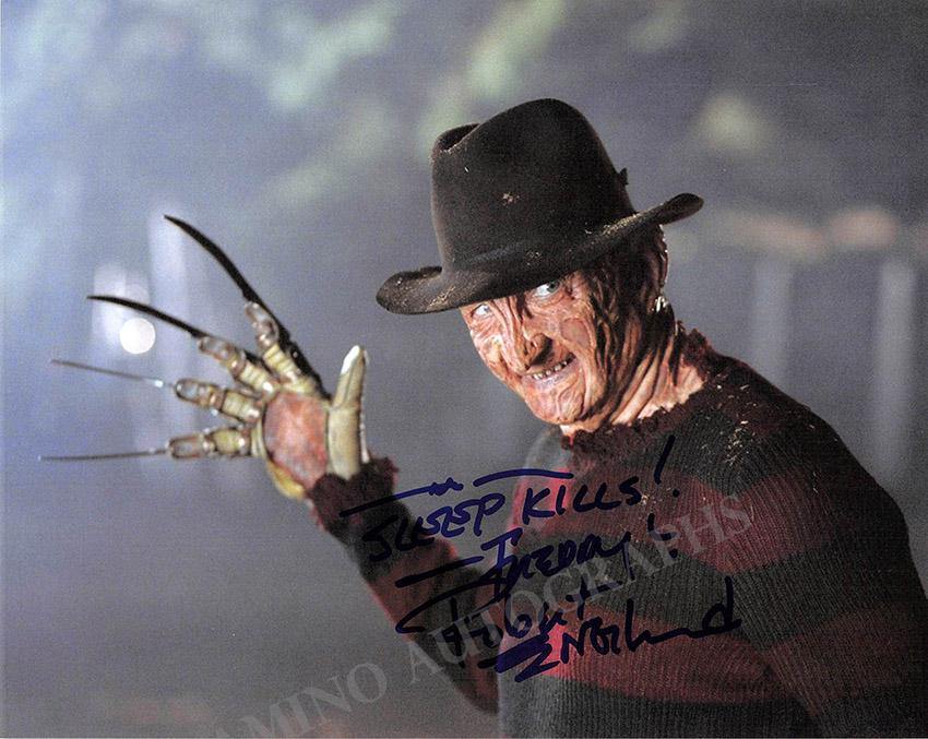 American actor (b.1947) and also voice actor and director, best known for playing Freddy Krueger in the Films Series "Nightmare on Elm Street".  Signed photograph shown as Freddy Krueger, with a short sentiment "sleep kills".  Size is 10 x 7.9 inches, in excellent condition.
