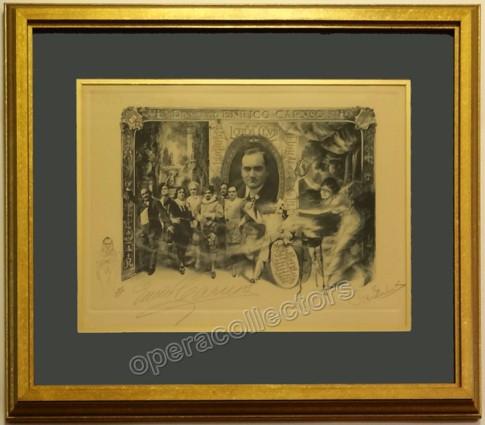 Beautiful, rare gravure print by T. Sindelar in a gorgeous menu honoring Enrico Caruso by the Lotos Club in New York City, 1916. Menu depicts a group of Caruso images in his leading roles at the Metropolitan Opera, where he was the star tenor since 1903. Menu is signed in pencil by Caruso, framed with a double acid-free matting, in excellent condition. Rare / hard to find!
