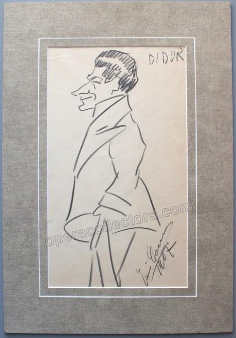 Gorgeous drawing of bass Adamo Didur (1873-1946) made and signed in 1907 by Enrico Caruso. Adamo Didur was a friend of Caruso. Large size! Caricature is on paper, size is 7.5 x 13 inches, mounted on a mat (12.75 x 18.25 inches). Caricature can be removed from the mat very easily, as it is mounted with photo corner. In excellent condition