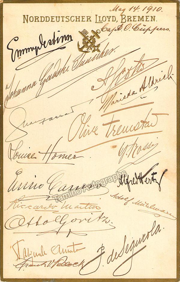 Signed by Enrico Caruso, Antonio Scotti, Geraldine Farrar, Emmy Destinn, Johanna Gadski, Louise Homer, Riccardo Martin, Otto Goritz, Mariska Aldrich, Olive Fremstad, Giulio Rossi, Alfred Hertz, Andres de Segurola, Pasquale Amato, Frank Pollock and Adolf Muhlmann - 17 signatures in total. Size is 6.75 x 10.75 inches, in very good condition!