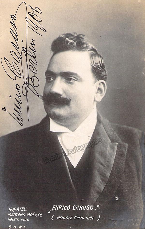 Super star Italian tenor (1873-1921), acclaimed at the major opera houses of Europe and America, for his interpretations in a wide variety of roles from the Italian and French repertoires. Additionally, he made approximately 260 commercially released recordings from 1902 to 1920. Signed photo postcard, shown as himself, signed in Berlin, dated in 1906. Size is 3.5 x 5.5 inches, in excellent condition.