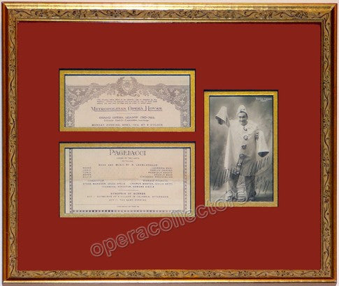 Beautiful signed photo postcard showing Caruso as Canio in Pagliacci - his most famous role! - Matted and framed together with a clip from a Metropolitan Opera program for a performance of Pagliacci with Caruso as Canio, 1914. Signed photo postcard is dated by Caruso in London in 1914. Bold, highly clear signature. Double, acid-free matting, quality frame, all in excellent condition